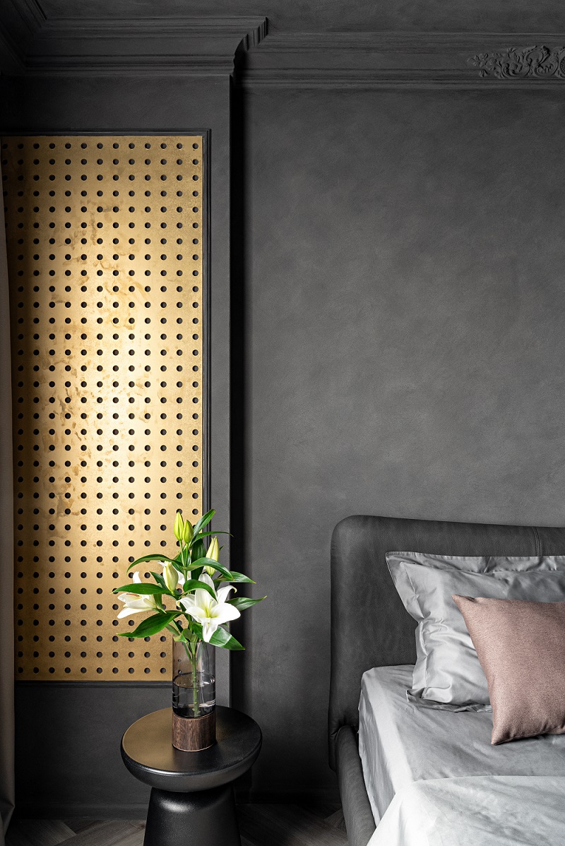 Чтобы разнообразить такой интерьер, дизайнеры используют разные орнаменты и узоры, молдинги и снова немного золота, как сделала Анастасия Федоровская в этом проекте.