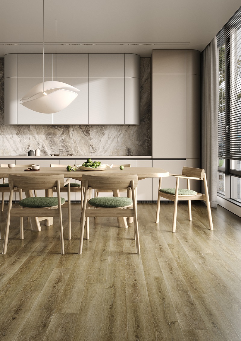 Сначала я думал об обычной плитке, однако в процессе подумал о кварцевом ламинате. Заказать решил в компании Fargo, так как много хорошего о них слышал да и бренд известен на всю Россию. Выбрал Fargo Comfort. Хочу сказать, что совсем не разочарован кварцевым ламинатом, укладывается он легко и быстро, по нему приятно ходить, а кухня визуально стала выглядеть еще лучше.
