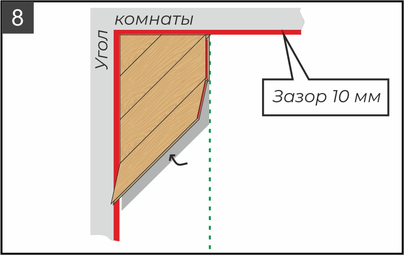 9.2. Отрежьте край ряда по указанной на рисунке красной линии (она формируется в зависимости от левого угла комнаты). Исходя из расчетов (см. рисунок 5) при необходимости подрежьте плашки по длине. В зависимости от типа пилы, которую вы используете, разберите плашки и отпилите каждую по отдельности или сделайте это уже в сборке, предварительно наметив линию при помощи угольника и карандаша.