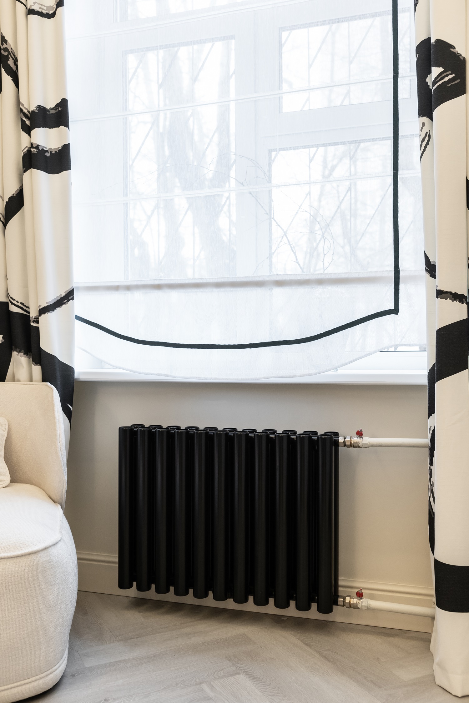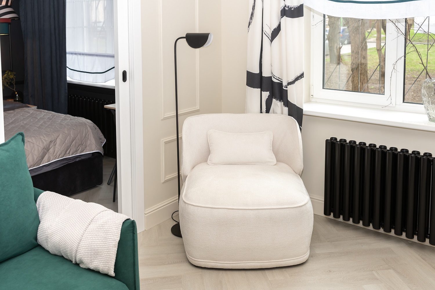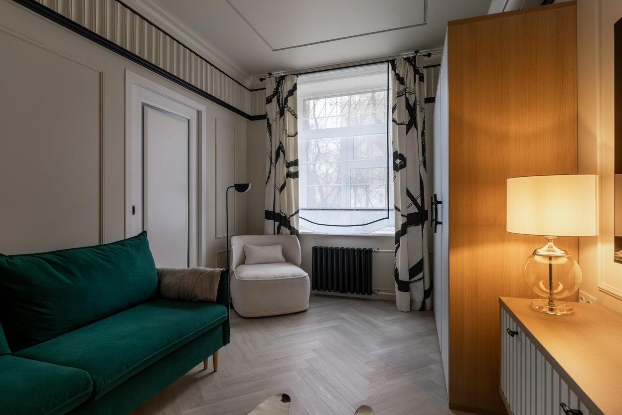 Первым делом дизайнер Ирина Райхер избавилась от многоцветной палитры в гостиной, оставив два основных – черный и белый. При этом, как и хотели герои, в гостиной остался главенствовать белый цвет. А в спальне — черный.