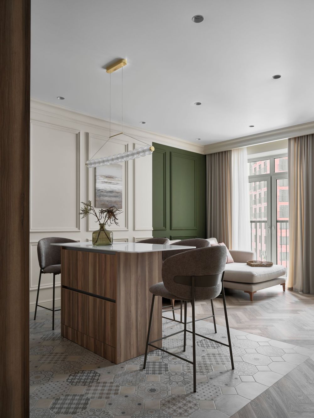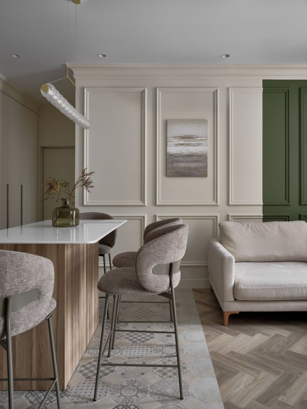 Классика этого интерьера читается в деталях — филёнках на стенах, широких карнизах и спокойной симметрии. Пространство звучит современно и легко, как продуманная композиция без лишних нот. Акцентная стена в цвете хаки добавляет интерьеру глубину и гармонично объединяется с тёплым деревом в отделке.